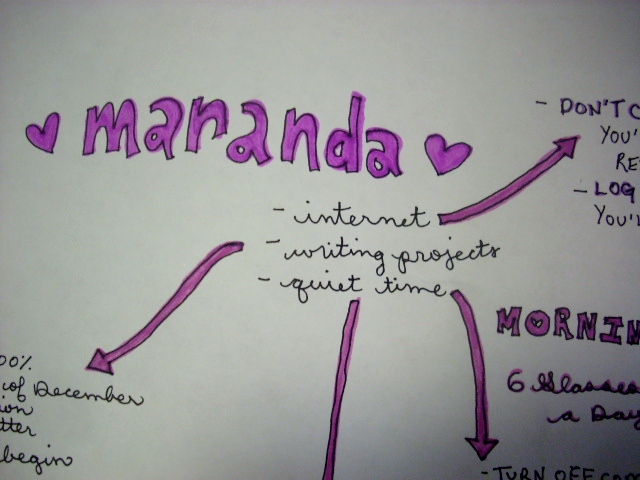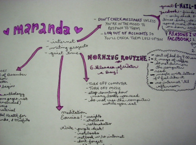 I write these things called Life Lists (credit to Dave Cave for the name!). I take a big sheet of paper, write the issue I wanna work on in the middle (the ‘issue’ is generally myself, so I just write my name), and then I branch out with all these parts of my life and habits and whatnot and I write smaller lists about what I want and what I need to change and all sort of things. The themes range from mental health to daily life to internetz to writing, etc. It clears things up to write things down, and it helps make my goals seem more concrete, more do-able.