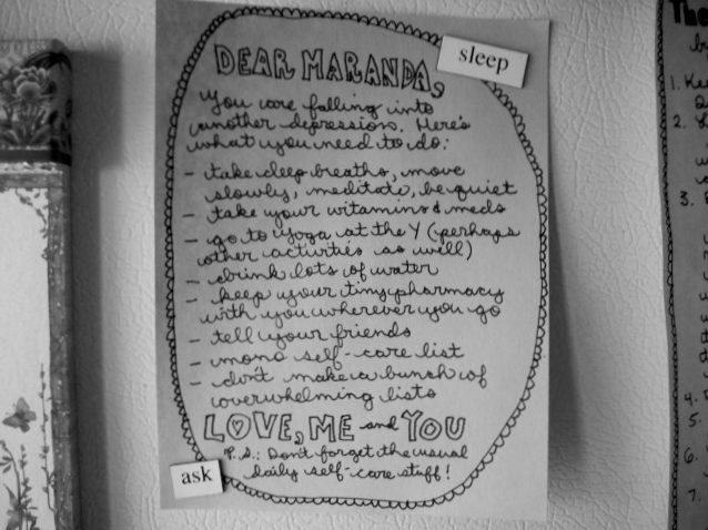 The first list is on my fridge, and the second list is in my diary. I probably read them about a hundred times a day. My friends ask me how I’m doing, and I don’t know. I feel… weird? Good weird and bad weird? I feel like I’m doing all sorts of wonderful things, and I also feel like I’m due for another breakdown (or breakthrough?). (But I am also 100% not interested in re-entering an institutionalized setting at this time, so don’t go making any recommendations or worrying about me, okay? Your worry is what often keeps me silent! I’m just dealing with really bad anxiety right now, I’ll get through it.) I feel like I need to go back to NA meetings, even though it scares me because sometimes I just feel so alone and useless there. Also, although I feel really good about the writing projects I’m working on and the plans I’m making, I also feel my low self-esteem creeping in everyday. Like, sometimes I don’t get why people even wanna hang out with me at all, let alone why they bother making efforts to invite me over, ask me questions and tell me stories, give me yummy food and colourful drawings, and seem to actually give a fuck.
