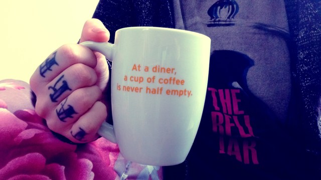 {image description: My hand holding onto a white mug that says in yellow letters: “At a diner, a cup of coffee is never half empty.” I stole it from Denny’s.}