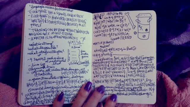 Although there were also somatic exercises as part of the workshop, I skipped them this time because I was having the kind of day where I didn’t feel like being in my body. I scribbled notes and drew pictures of bones and pill bottles instead.