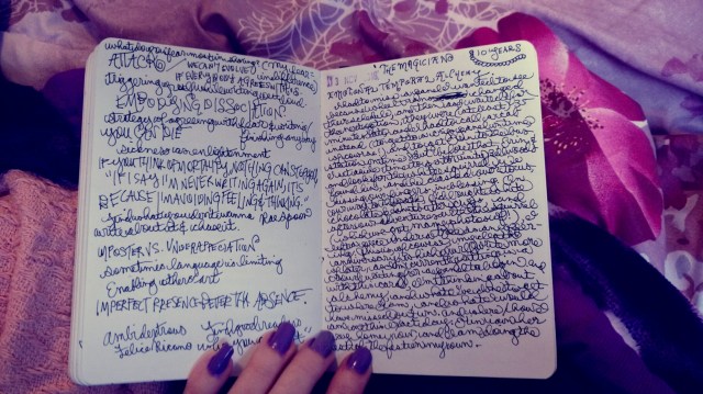 {image description: My diary held open again. Messy black ink of notes on poetry, a doodle of a bottle of pills, and thoughts during panels.}