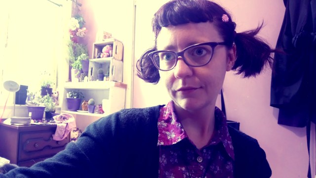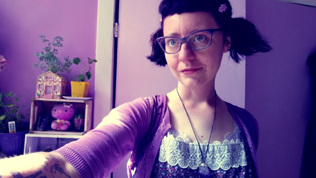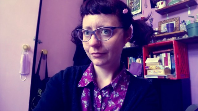 {image description: Selfie, Summer 2019, taken as I sit in front of the rooming house where my nana lived in 1950. I’m shown from the chest up, wearing a black cord necklace with a heart-shaped shungite crystal, my asymmetrical below-the-shoulders hair dyed clover green, wavy, no bangs. Round, mauve tortoiseshell glasses, unsmiling and many feels, lipstick a shade called Spellbound, bright magenta. Purple plastic flower barrette, roots growing out golden. Pale skin, zits always visible under make-up and sunscreen. Outside of the frame, my elbows are resting on my knees. The dress described earlier, yellow, black, and white vertical stripes, overlaid with a floral print of clusters of roses in various shades of purple, it’s sleeveless, shoulders exposed, a golden zipper following the collar. Behind me, orange flowers, red bricks, green leaves, everything glowing in the sun.}
