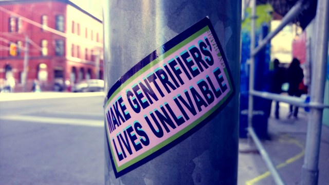 501 Queen streetcar, Westbound. Hundreds and hundreds of storefronts, less indie, more chains. I like watching poor people jaywalk in poor neighbourhoods, in used-to-be poor neighbourhoods where we haven’t been fully pushed out yet. The way poor people own the streets, know the traffic, become invincible. Regent Park and Parkdale are two of these places. Long, long histories, resisting gentrification, refusing to be pushed out, resisting racism, fighting the BIA’s and local businesses and city officials who put spikes on benches or remove them altogether, resisting landlords, real estate landlords, the bigots and capitalists and white supremacists in and out of office.