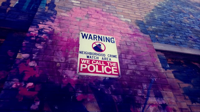 {image description: Close-up of the brick wall, pink puffs of cherry blossoms blooming, with a sign posted in the centre: Black allcaps on white: WARNING. NEIGHBORHOOD CRIME WATCH AREA. White allcaps on bold red: WE CALL THE POLICE. Street-sign style illustration of mysterious figure in black, crossed out in red.}