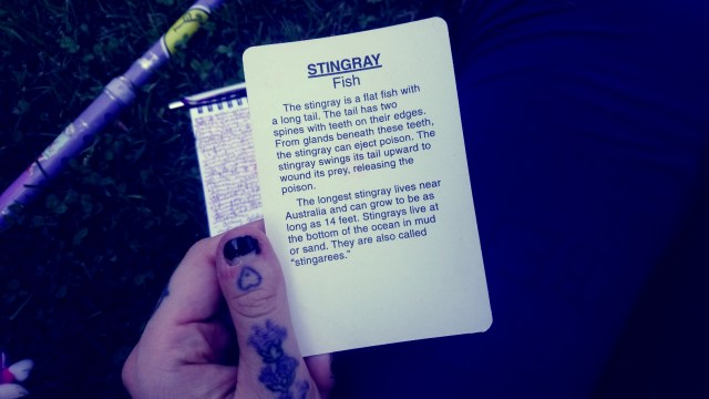 {image description: Close-up of a card in my hand, held between thumb and forefinger, nails painted deep violet, short. I found the card on the ground as I recognized the address I was seeking out no longer held a building. Illustration of a stingray, labeled STINGRAY in bold black allcaps.}